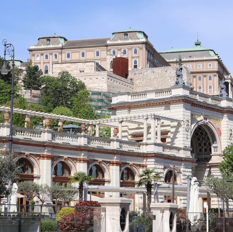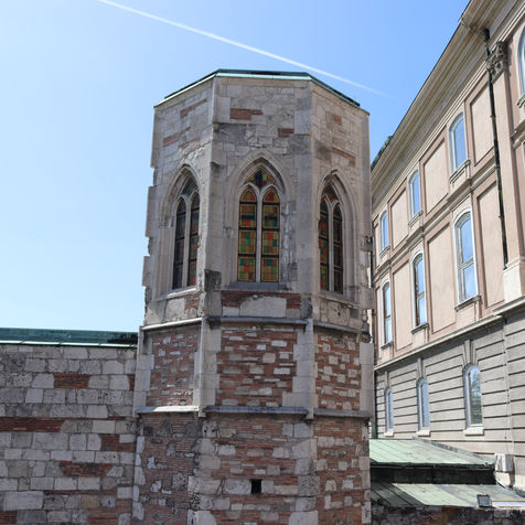 As you continue the stroll, the rear facade of the Buda Castle Palace comes into view, followed by the Castle Wall (Ybl retaining wall), which is adorned with an elegant coat of arms. Beyond the wall stands the Hungarian Royal Riding School. A short walk further leads to the Karakas Pasha Tower.