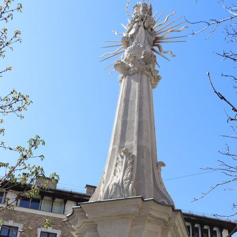 In the final part of the tour, we walk back from the Europa Park to Batthány Square. As soon as we get down from the hill through the Kagylo Street stairs, we stumble upon the statue of Maria Immaculata. This statue was erected in 1724 after the plague. The sight of the Market Hall and the Parliament building also indicates that we have come around.