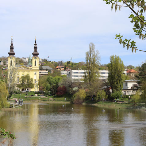 As the path continues, it is worth occasionally looking back to admire the Church of St. Imre. A fountain stands in the center of the lake.