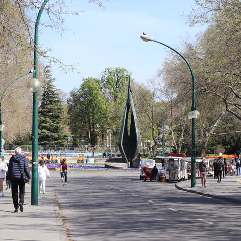 As we approach the garden, we are greeted by an elegant gate. Upon entering, we can see many flowers, including tulips. Continuing further into the park, visitors can view the building of the Petofi Literary Museum (here there is a permanent exhibiton for the poet, Sandor Petofi), as well as the towers of the Budapest University Church, which belongs to Pazmany Peter Catholic University. In front of the building, a statue of the renowned poet, Sandor Petofi can be found.