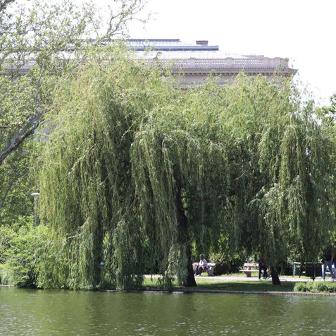 As we continue our walk along the lake, we pass beneath willow trees, creating a good atmosphere. Shortly after, we arrive at a pier that offers a scenic vantage point from here to admire the surrounding buildings, the central fountain, and the lake's wildlife.