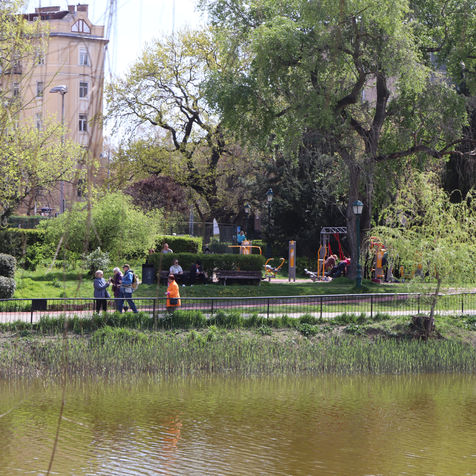 The park offers a picturesque view of the surrounding buildings and the lake. We begin the tour around the lake from the left side. Visitors can observe local wildlife such as ducks and partridges and people with some luck can see grey herons also.